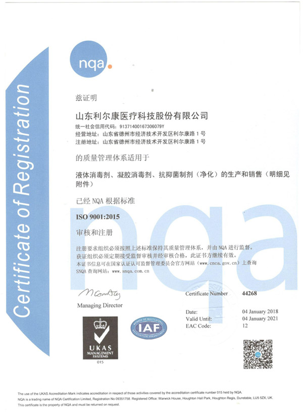 德州利爾康消毒劑9000認(rèn)證之ISO9